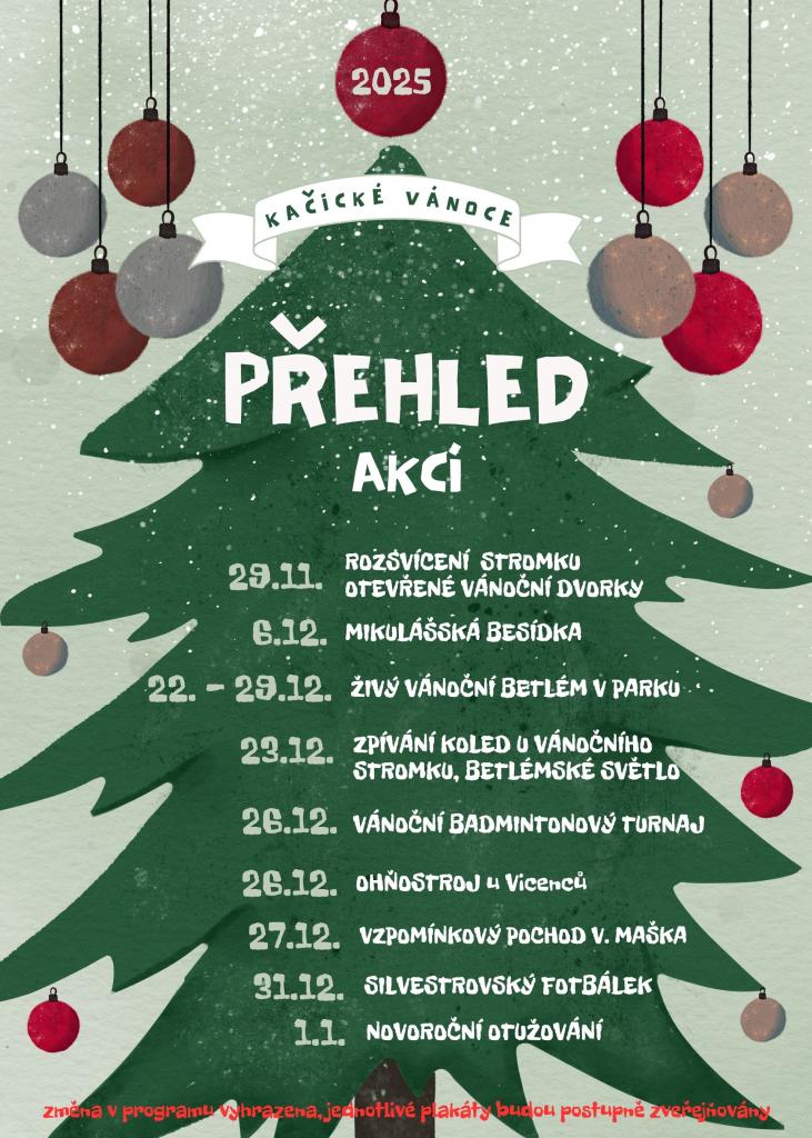 Obec Kačice zve všechny na vánoční akce, které se uskuteční v prosinci. Přijďte si užít Mikulášskou besídku, zpívání koled u vánočního stromečku a navštivte živý Betlém v parku. Také se můžete těšit na vánoční badmintonový turnaj a silvestrovský fotbálek. Nezapomeňte na novoroční otužování a vzpomínkový pochod. Všechny akce jsou skvělou příležitostí, jak se setkat s přáteli a užít si vánoční atmosféru.