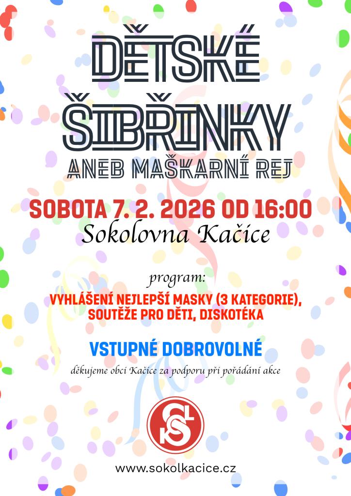 Sokol Kačice Vás srdečně zve na maškarní rej pro děti, který se koná v sobotu 7. února 2026 od 16:00 hodin v Sokolovně Kačice. Program zahrnuje vyhlášení nejlepších masek ve třech kategoriích a soutěže pro děti a diskotéku. Akce je podpořena obcí Kačice.
